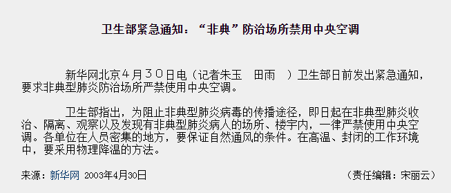 經(jīng)歷過(guò)“非典”的朋友想必還記得,2003年夏天,為防止病毒傳播,原衛(wèi)生部曾下發(fā)禁令,要求有“非典”病人的場(chǎng)所不能開(kāi)中央空調(diào)。