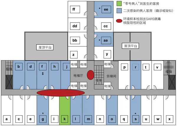 注:*表示一個(gè)房間有2人感染;?表示“零號(hào)病人”曾在這個(gè)房間逗留(來(lái)源:wwwnc.cdc.gov[5])